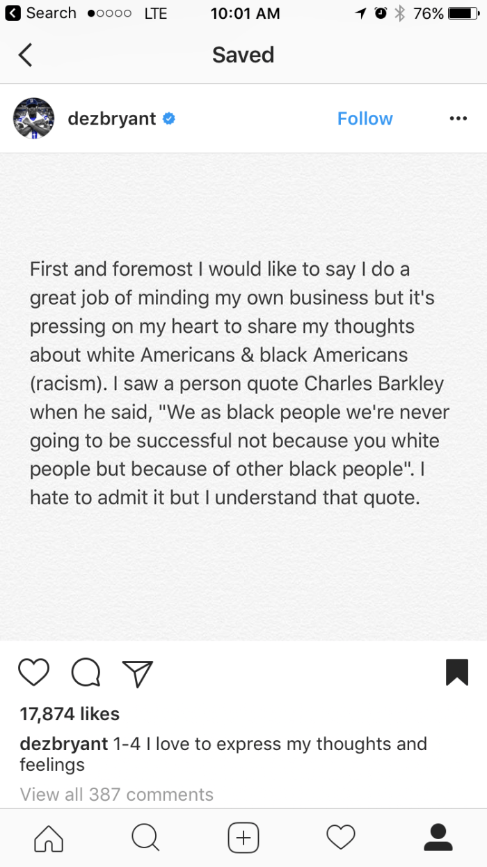 What Dez (and many others like him) fail to understand is that he is the “one percent”. Thanks to his fame and what he does on the football field, he (and others like him) is insulated against the reality of many Black Americans.