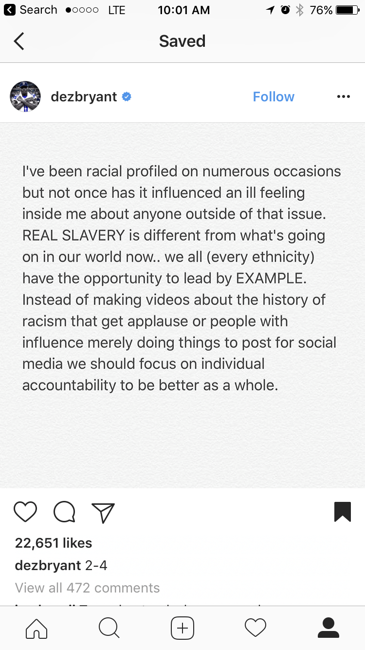 What Dez (and many others like him) fail to understand is that he is the “one percent”. Thanks to his fame and what he does on the football field, he (and others like him) is insulated against the reality of many Black Americans.